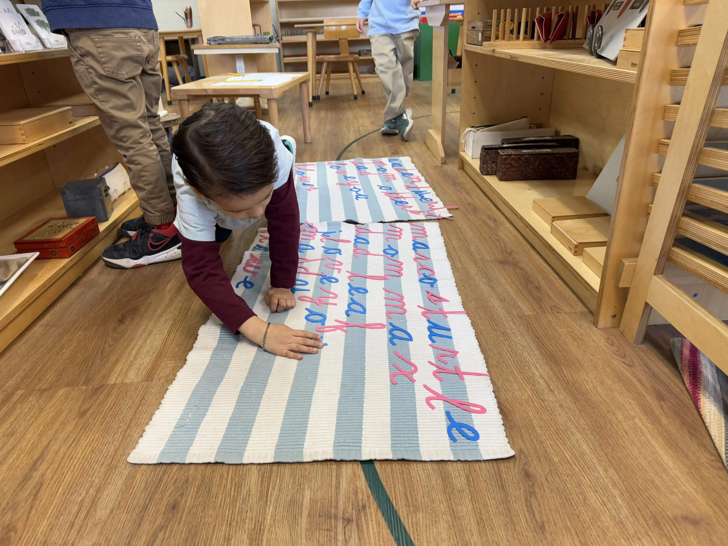 This past month has also brought a great interest in reading and writing activities in class. We have read many different stories during circle time, and it was wonderful to hear all the children's thoughts when story time was over. Our younger students have been especially drawn to Sensorial activities. We often see them matching shapes from the geometric cabinet to their corresponding shape cards, working from one end of the room to the other. This material is excellent for developing memory and concentration, as well as practicing lightness of touch when tracing shapes—an important skill that supports future writing development.